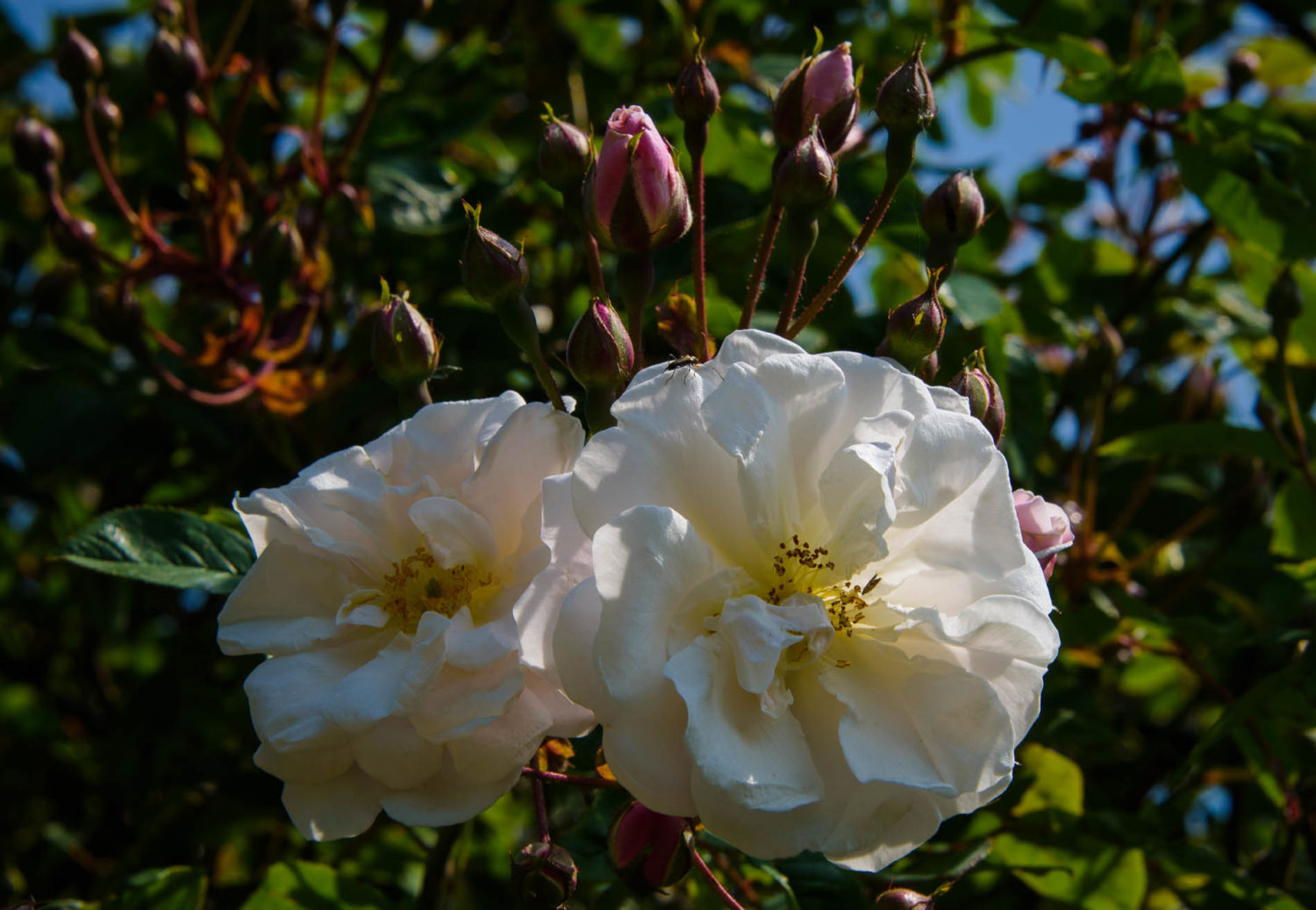 The main paths crossing the site converge on a central round pond and fountain, surrounded by eight clipped Irish yews. Long borders brim with plants chosen to complement and underplant the roses. They also extend the season, providing colour, shape and scent before the roses bloom and after their petals fall. In June the roses are accompanied by striking spires of white foxgloves.